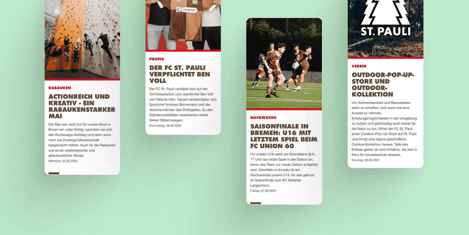 Erstellung einer Webseite, die alle Inhalte rund um den FC St. Pauli vereint – egal, ob auf eigenen Kanälen gesendet oder in Newsseiten und Blogs erschienen. Zusätzlich sollen alle Inhalte der bestehenden Website in die neue responsive Website migriert werden.